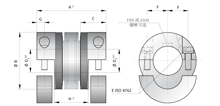 · 兩個夾緊套環(huán)半部可向同一方向移動。套筒側(cè)面使用夾緊套環(huán)和兩個側(cè)面螺釘ISO4762